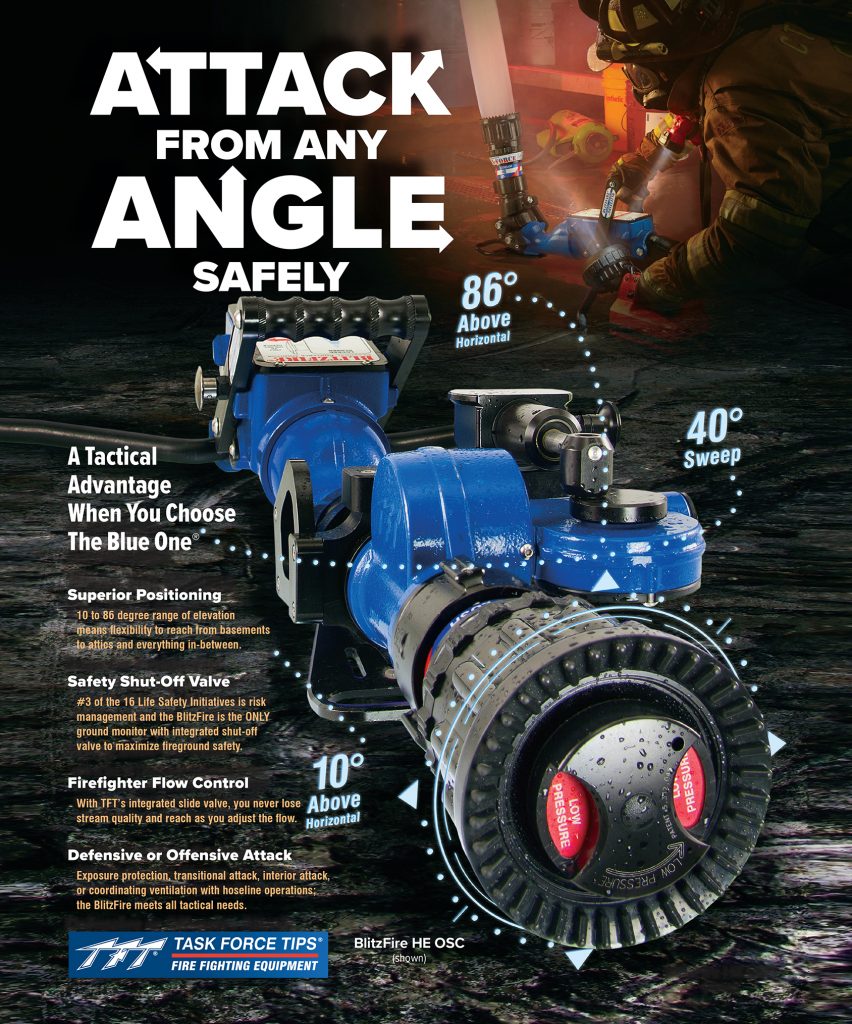 The base model’s attack angle (10 to 46-degree elevation) is perfect for directing a fire stream into any door or window opening. The high elevation (HE) version provides an even higher 86-degree up elevation angle for tactical advantages, such as the ability to place a high-volume stream directly into an overhead or reaching a pipe rack system that’s directly in front of you.