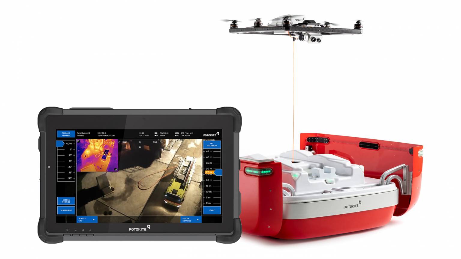 Fotokite Sigma. A Situational Awareness System for First Responders.Focus on your mission. Drastically improve your team's situational awareness. The Fotokite Sigma allows you to gain an impressive, unobstructed overview of any incident in an instant. Live stream and document mission-critical aerial views with total operational freedom.The Fotokite Sigma consists of the Ground Station and the Kite. A tablet or computer runs the Fotokite Live App which shows the real-time thermal and low-light video streams, giving teams actionable information throughout their mission safely and reliably; no piloting necessary.